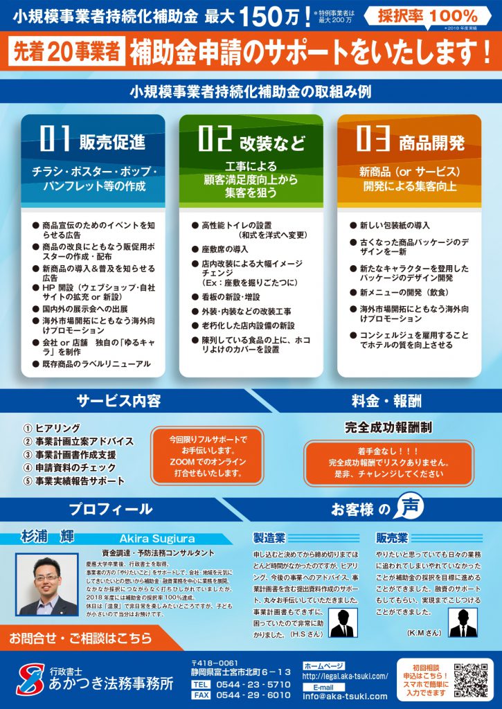 2020年8月15日 / 最終更新日時 : 2020年8月15日 akatsuki 補助金 小規模事業者持続化補助金! 次回公募10月2日締切 ご検討の方は 8月24日(月)から初回無料相談(20分)で対応いたしますのでご連絡ください コメントを残す コメントをキャンセルメールアドレスが公開されることはありません。 * が付いている欄は必須項目ですコメント * 名前 * メール * サイト 次回のコメントで使用するためブラウザーに自分の名前、メールアドレス、サイトを保存する。